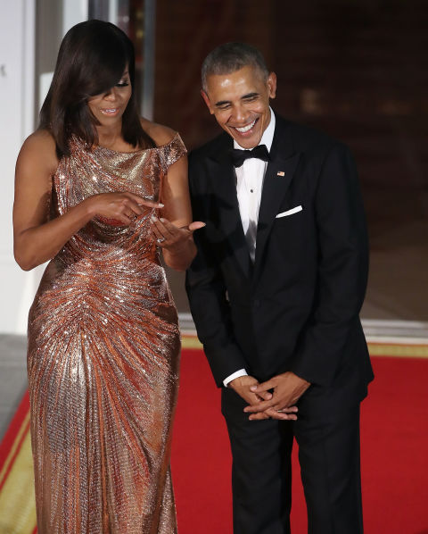 First Lady Michelle Obama just made her appearance for her final State Dinner at the White House. She's been dressed to the nines for the high-profile banquets every year, sporting Brandon Maxwell to Vera Wang, so for her sartorial finale, she ended on a big note—with a chainmail Atelier Versace gown.