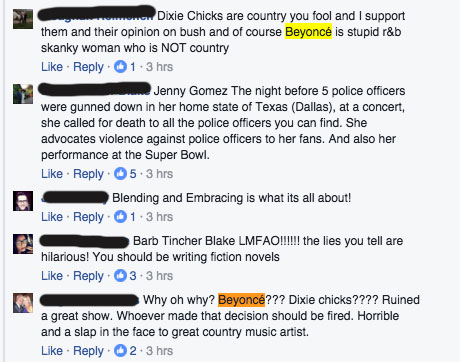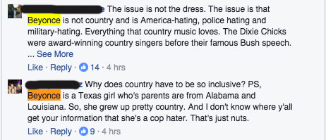 On Facebook, commenters took issue with her not being a "real country star." Others were mad at her involvement in the Black Lives Matter movement.