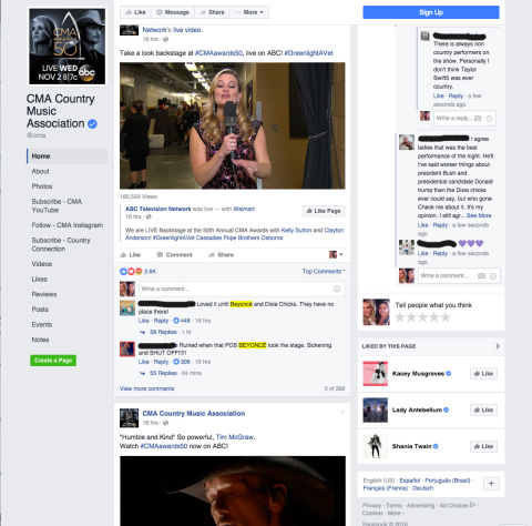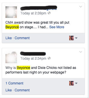 But look at CMA's Facebook and Twitter page right now, and all traces of Beyoncé are gone, except for some mentions in the comments by people who were angry the association allowed her to perform.