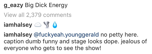 "No petty here," Halsey responded. "Caption dumb funny and stage looks dope. Jealous of everyone who gets to see the show!"