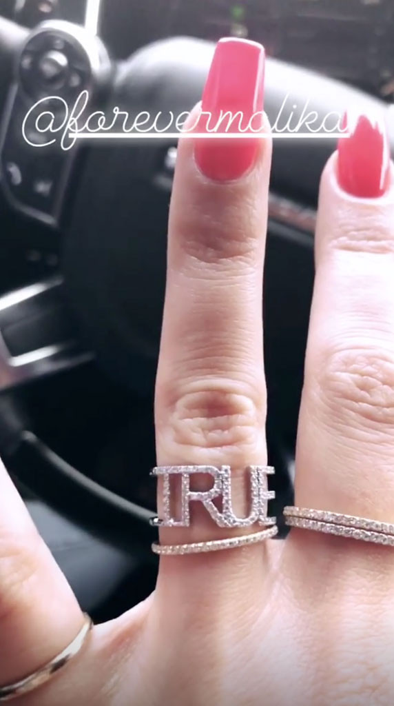 Khloe Kardashian showed off her new custom-made diamond ring emblazoned with her daughter's name, on her Instagram Stories on Wednesday. The mom was most likely gifted the piece of jewelry by best friend Malika Haqq, who she tagged in the image, as a way to feel she's never too far from her daughter.